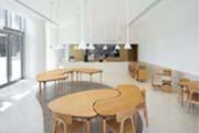 一個蠶豆形的大飯桌就是店的中心區(qū),它由十個拼圖式的小桌子組合而成,可以根據(jù)不同的需要拆分組合。設(shè)計師們與21cake都注意到,社區(qū)的居民在一天中對面包店的空間需求不盡相同:早上,小桌可供獨自享用早餐;下午和晚上,大桌可用于不同大小的聚會,從幾個人的烘焙課到一群人的生日會。面包和蛋糕還可以放在大飯桌上展示。小推車是設(shè)計中的另一個創(chuàng)新元素。