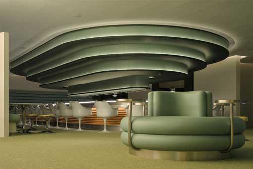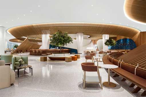 建筑外部是由標準層疊的平臺與有機網(wǎng)格狀的鏤空墻體構(gòu)成,內(nèi)部空間則運用溫暖和愜意的材料,放松舒適的陳設(shè)和完整的五星級餐飲體驗。從近景看,這個具有光滑編織特性的混凝土外立面具有更加多元的燈光效果,光線可以從不同角度穿梭于平滑的表面,讓充滿活力的色彩拼貼為繁忙街道上的行人和穿梭于江面的船只創(chuàng)造了一個燈塔。