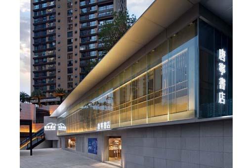 唐寧書店四海城店位于廣州番禺四海城廣場的核心位置,前接下沉廣場,背靠住宅,鬧中取靜。以社區為基,該項目的選址優勢在疫情下得到放大。在原規劃中,橫跨四十多米的兩層建筑屬天臺馬場的配套設施,故空間非常低矮,結構不規則,難以作為商業空間使用。立品團隊通過以下一系列設計手法來改善空間布局。